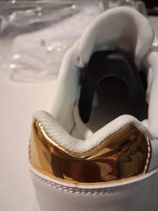 Zapatillas deportivas con un diseño moderno y llamativo. - Detalle metálico en color dorado en el talón. - Combinación de blanco y dorado.