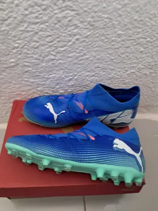 Botas de fútbol Puma Future en color azul con detalles en rosa. - Diseño moderno y llamativo. - Suela con tacos para césped artificial o natural.