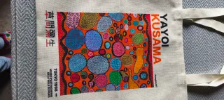 Bolso tote con diseño artístico de Yayoi Kusama. - Color beige con estampado multicolor. - Material lavable.