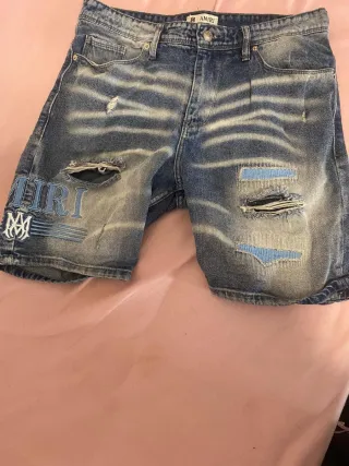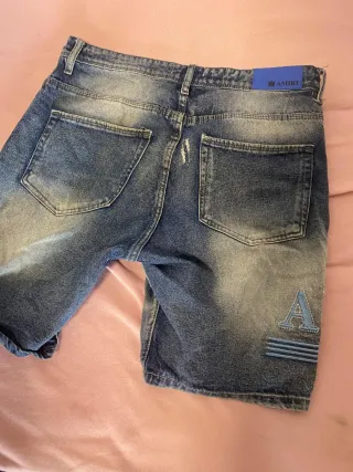 Pantalón corto de mezclilla con un diseño desgastado y detalles distintivos. - Parche de cuero azul con logo en la parte trasera. - Detalle de A bordada en la pernera derecha. - Efecto desgastado y lavado.