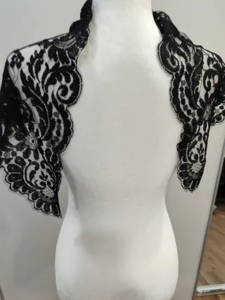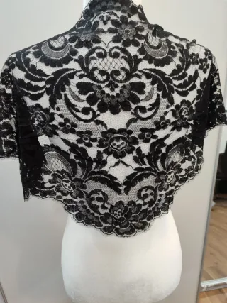 Elegante mantilla de encaje con un diseño intrincado. Medidas 1 metro x 48cms en el pico - Material: Encaje - Color: Negro - Diseño: Floral y arabesco