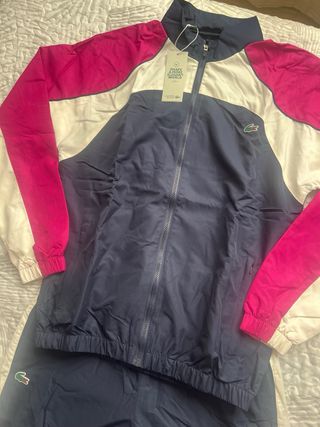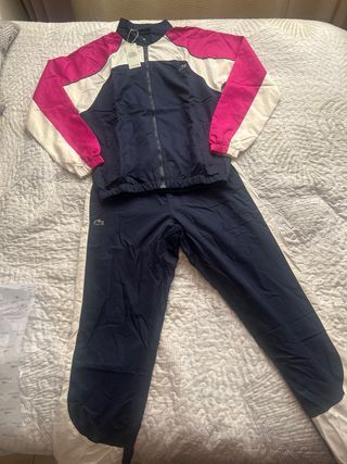 Conjunto deportivo de dos piezas. - Chaqueta con cremallera completa. Medidas hombros 55cm. - Pantalón 103cm de largo y 40cm de cintura “elástico”. - Diseño tricolor.