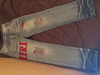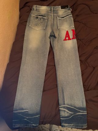Pantalones vaqueros de Amiri con un diseño desgastado y detalles en rojo. - Estilo desgastado y con rotos. - Logo de la marca en rojo. - Lavado claro.