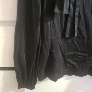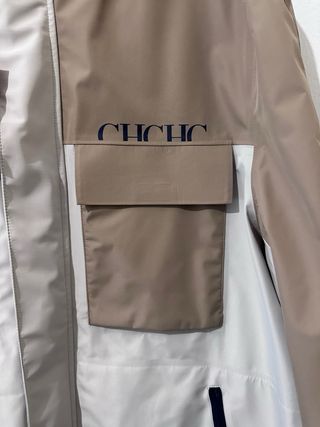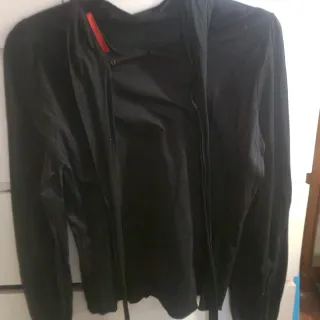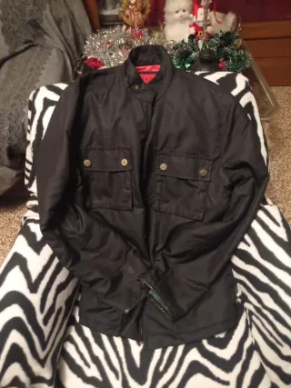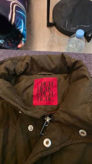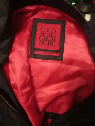 Chaqueta negra de la marca CH, con un diseño moderno y funcional. - Cierre frontal con botones. - Cinturón ajustable a la cintura. - Bolsillos frontales con solapa. - Forro interior de color rojo. -solo ha perdido el broche interno de un boton