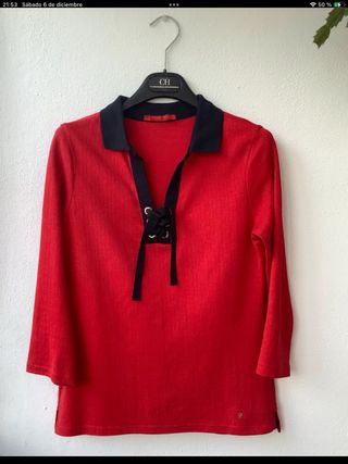 Elegante top de Carolina Herrera en color rojo. - Cuello tipo polo con detalle de lazada. - Manga tres cuartos. - Tejido con textura. - Detalle de logo bordado en la parte inferior.