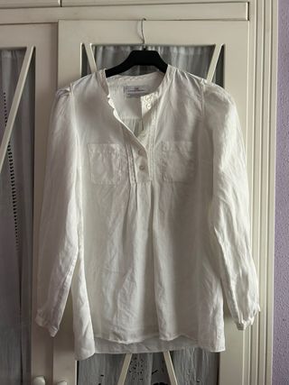 Elegante blusa de manga larga de la marca Carolina Herrera. - Diseño clásico y atemporal. - Cuello mao con botones. - Bolsillos frontales. - Tejido ligero y transpirable.