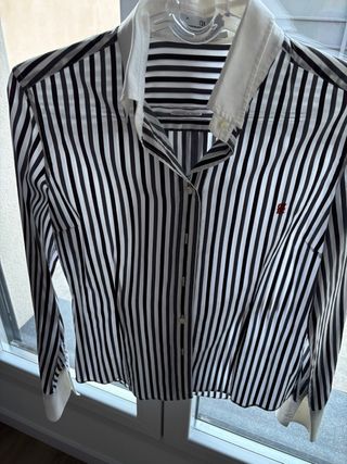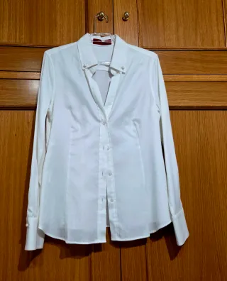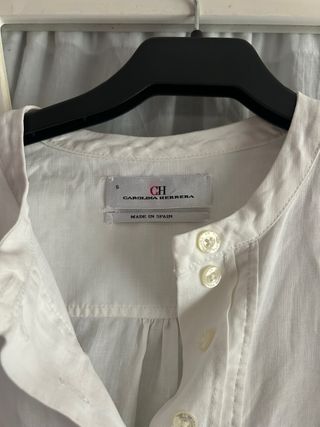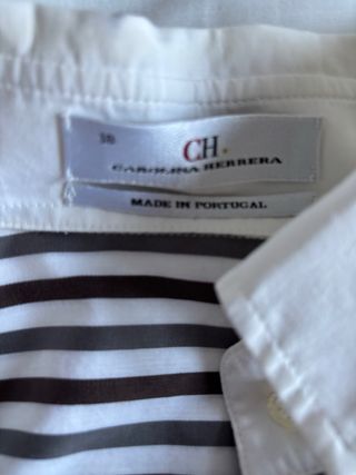 Camisa original CH Carolina Herrera para mujer, de manga larga, en color blanco clásico. Diseño elegante y atemporal, con corte entallado que estiliza la figura. Incluye detalles interiores en cuello y puños con estampado floral, característicos de la marca, y logo CH bordado discreto. Tejido de algodón de alta calidad, cómodo y transpirable. Prenda en muy buen estado, con poco uso, sin manchas ni desgaste. 📏 Talla: (añádela si la miras) 👕 Estado: Muy buen estado, poco uso