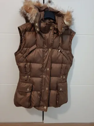 Chaleco largo de Carolina Herrera. - Color marrón con detalles - Cinturón marron para ajustar. - Diseño plumón y plumas talla S pero para talla M/L serviría es enorme por eso lo vendo tambien es reversible