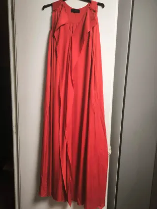 Elegante vestido largo de Carolina Herrera. - Diseño sin mangas. - Detalle de volantes en cascada. - Escote en V. Vestido de Carolina Herrera en rojo de seda tanto el vestido como el forro. Tiene bolsillos, será como una talla S. El modelo es recto y tiene una abertura por delante. El bajo tiene una mancha, en la foto se ve mucho más de lo que es en realidad. Solo 2 usos pero lo sé llevó a la tintorería. Lo