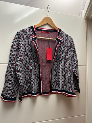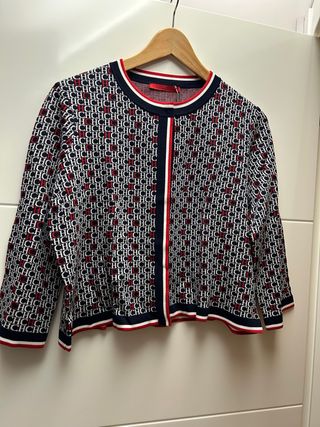 Chaqueta de punto con estampado integral del logo de Carolina Herrera. Presenta un diseño de cuello redondo y cierre con dos corchetes en la parte de arriba. Nueva, sin estrenar. Precio original 270€