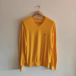 Exquisito jersey de la línea premium CH Carolina Herrera. Una prenda para quienes valoran la auténtica calidad y el confort. 100% algodón fino de la más alta calidad. El tejido es delicado, muy suave e increíblemente agradable al tacto. Fabricado en Bulgaria. Clásico cuello en forma de V (V-neck) y manga larga. Logo bordado en el pecho. Talla: M, Medidas reales: Axila a axila: 55 cm, Longitud: 70 cm, Hombro a hombro: 43 cm, Longitud de manga desde el hombro: 71 cm. Color: Amarillo brillante, limpio y soleado. Lo vendo porque no me sirve la talla. Usado una vez. #carolinaherrera #chcarolinaherrera #jersey #pull #maglione #knitwear