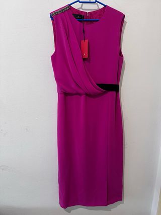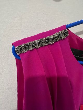 Elegante vestido de fiesta de Carolina Herrera. - Color magenta vibrante con detalle de cinturón negro. - Diseño sin mangas con drapeado asimétrico. - Adorno de pedrería en el hombro.