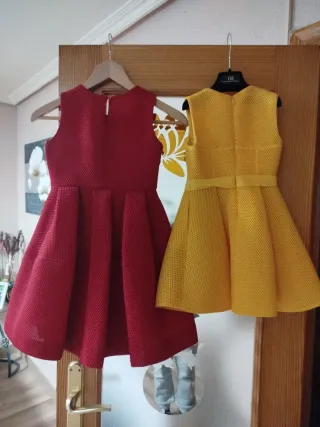 Conjunto de dos vestidos de fiesta para niña de la marca Carolina Herrera. - Vestido rojo con detalles florales en el hombro. - Vestido amarillo con cinturón de lazo. - Tejido texturizado. - talla 8,9 y 3,4 - se venden por separado también - ideal para hermanas - como nuevos 2 puestas