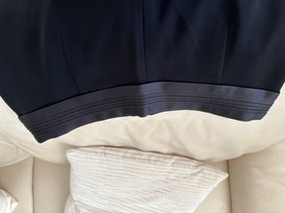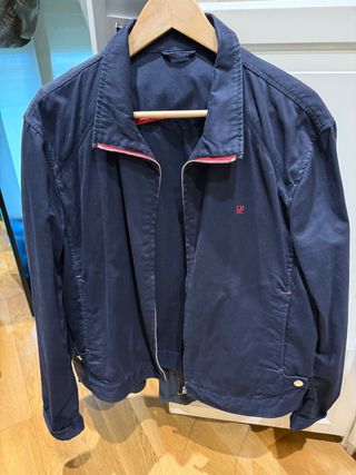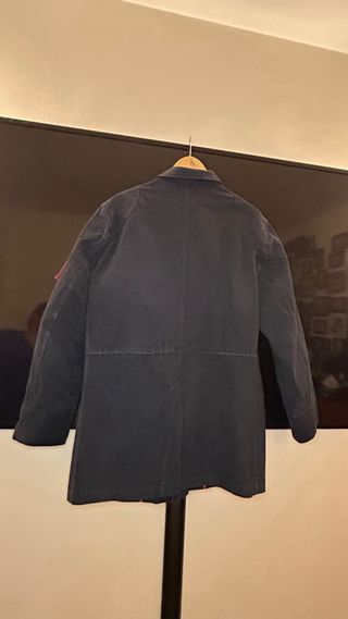 Abrigo de lana azul marino de la firma Carolina Herrera, en talla S, con corte recto y solapas clásicas. Presenta bolsillos con solapa, forro interior en azul con detalles en rojo y botones personalizados con el logo "CH". Lo vendo porque me queda pequeño, es súper bonito. Ideal para quien busque un abrigo de diseñador elegante y no le importe añadir el botón que falta. (le falta uno de los botones frontales, tal y como se aprecia en las fotografías)