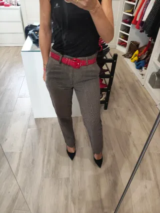 Pantalón de la marca Carolina Herrera. La etiqueta marca una talla 32, pero realmente es aproximadamente una talla 36 (no obstante ver medidas en las fotos). Usado, pero en buen estado. De color gris con rayas (algunas rojas). Pantalón de vestir Carolina Herrera. - Diseño a rayas. - Cinturón rojo a juego.