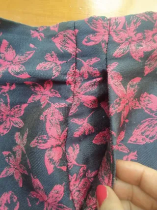De color azul marino de fondo y estampado floral en rojo. Modelo recto hasta la cintura donde salen pequeñas tablas a un lado dando un ligero vuelo. Talla 6 de CH, hace 38/40 Medidas de axila a axila 46 cm., cintura 38cm.y largo 116cm.
