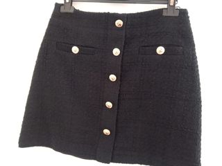 chaqueta negra de estilo tipo chanel, tweed de Zara, talla XS (equivalente a 34 ) Es una prenda elegante y versátil, ideal para cualquier ocasión. Perfecta para un fondo de armario, atemporal y un toque chic. Ideal para la oficina. - Diseño de botonadura frontal. - Bolsillos funcionales. - Detalle de flecos en los bordes. - Tejido de tweed de excelente calidad.