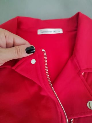 Biker corta hasta la cintura en tela de algodón, lleva tachuelas, botones automáticos, cremallera y volantes a cada lado. Lleva unas pequeñas hombreras para que siente mejor en la zona de los hombros. Tela muy suave. NUEVA SIN ETIQUETA, en color rojo. Favorece mucho, se puede utilizar para ocasiones formales e informales, es una talla M pero es elástica, yo utilizo una L normalmente. Comprada en la OVEJA NEGRA.