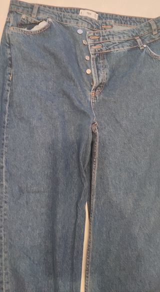 Jeans modelo wide leg ancho en color azul claro, cintura alta y pierna ancha,dos rotos frontales, dos bolsillos delanteros y dos bolsillos traseros. Esta nuevo sin etiquetas. Talla un poco pequeño a pesar de ser una talla 36 también serviría para una talla 34 Medidas:Largo 110cm x Ancho cintura 34cm /Ancho cadera 46cm Composición:100% algodón 🚚ENVÍOS EN MENOS DE 24H🚚