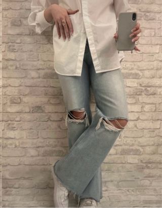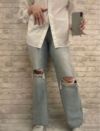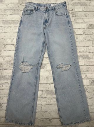 Jeans denim azul claro modelo Wide Leg de tiro alto,cierre frontal de cremallera,5 bolsillos,y rotos a la altura de ambas rodillas en ambas piernas.Estan nuevos sin etiquetas,usados una sola vez.No son elásticos y a pesar de ser una talla 38 servirían también para una talla 36 Medidas: Largo 111,5cm x ancho de cintura 40cm x ancho de cadera 48,5cm Composición: 100% algodón 🚚ENVÍOS EN MENOS DE 24H🚚