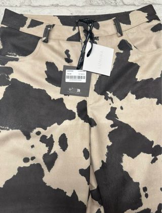 Jeans modelo wide leg de ante con estampado de vaca en color beige y negro de la marca italiana Lumina.Tiro alto,botonadura frontal con cremallera metálica,4 bolsillos y pata ancha.Esta nuevo con etiquetas,equivalente a una talla 36/38 a pesar de ser una talla M.Es el estampado actual en tendencia Medidas: Largo 111,5cm x Ancho de cintura 38,5cm x Ancho de cadera 49cm Composición: 95% Poliéster / 5% Elastano 🚚ENVÍOS EN MENOS DE 24H🚚