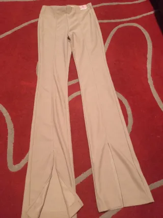 Pantalones largos de color beige. Sin usar con etiquetas - Piernas acampanadas con abertura. - Costuras marcadas en la parte delantera.