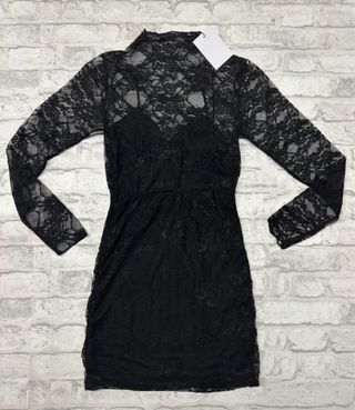 Vestido corto en color negro de encaje con forro interior negro (para que no transparente) y cuello redondo.Las mangas,la zona del cuello y del escote tienen transparencias combinado con encaje.Es un poco elástico y queda como un guante.A pesar de ser talla única iría desde una talla 32 hasta una talla 40.Nuevo con etiquetas Medidas: Largo 80cm x Ancho 36,5cm Composición: Exterior 97% Viscosa / 3% Elástico Interior 90% Poliamida / 10% Elástico 🚚ENVIOS EN MENOS DE 24H🚚