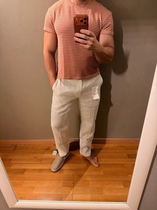 Camiseta de Zara con estampado de rayas finas, ideal para la temporada de verano. Viene con su etiqueta original. - Talla M - Diseño de rayas rojas sobre fondo beige - Colección Summer Wardrobe '25