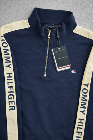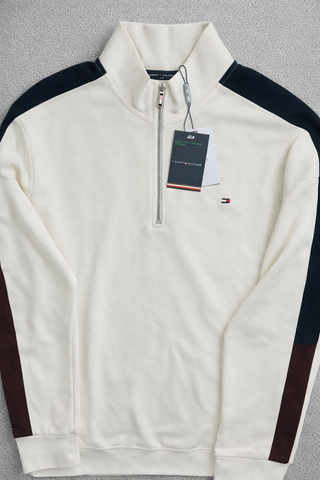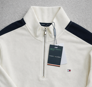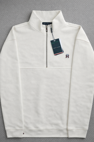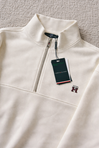 TOMMY HILFIGER Sudadera – NUEVA CON ETIQUETAS Prenda nueva y sin uso. Con etiquetas originales. • Talla: M , varias tallas disponibles • Algodón orgánico • Color blanco / crema con detalles azul marino • Media cremallera plateada • Logo bandera bordado en el pecho Modelo minimalista, elegante y fácil de combinar para un look casual premium. Envío rápido y bien protegido.