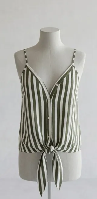 top a rayas en tonos verdes y blancos. Está sin estrenar, con su etiqueta. - Diseño de tirantes finos. - Cierre de botones centrales. - Detalle de nudo en la parte delantera. 1. Top 2. Tirantes 3. Rayas verdes y blancas 4. Cuello en V 5. Posibilidad de anudar en la parte inferior 6. Talla única. 7. Nuevo con etiqueta