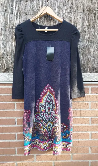 Vestido mujer punto, tejido invierno. De la marca Lavand. Con etiquetas, ideal para regalo.Color azul con estampado diseño en los bajos. Manga abullonadas, corte recto y holgado. Nuevo e impecable. Ideal para diario, entretiempo e invierno. Talla L (40). #vestido #vestidomujer #lavand #vestidoboho #vestidolavand #bohostyle #vestidoetnico #ethnicdress #bohodress #modamujer