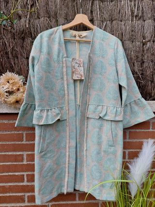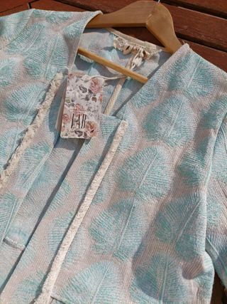 Chaqueta mujer. Nueva con etiquetas ideal para regalo. Chaqueta larga, vestir, entretiempo. Marca LAB Collection, Los Angles Barcelona. Marca nacional de diseño, tejido y acabados de máxima calidad. Hecha en España. Tejido con ligero brillo, motivo hojas bordadas. Preciosa. Medidas : Hombro 49 cm , sisa 50 cm y 88 cm largo. Etiqueta indica talla S pero equivaldría más a una talla M (38). Nueva a estrenar con etiquetas. Precio original 189€. Buen regalo. #chaqueta#regalo#nueva#abrigo#fiesta