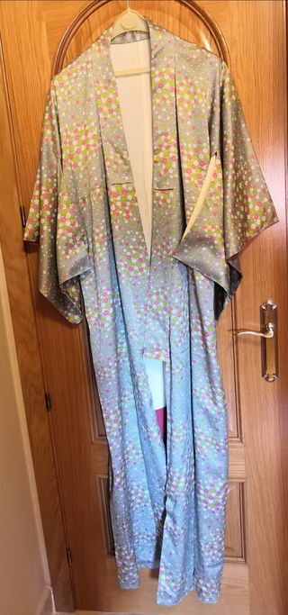 Kimono auténtico con un bonito estampado floral. - Diseño floral multicolor sobre fondo gris. - Comprado en Japón. - Probablemente sea de seda, no tiene etiqueta
