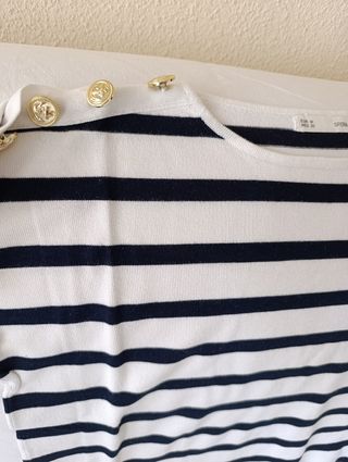 Jersey de punto, a rayas azul marino/negro y blanco. Con detalle de botones en la parte del hombro derecho. Talla: M. Medidas en foto. Marca: Sfera Composición: 70% viscosa, 30% poliamida. Estado: Se le cortó la etiqueta. Nuevo sin uso. Precio: 10€