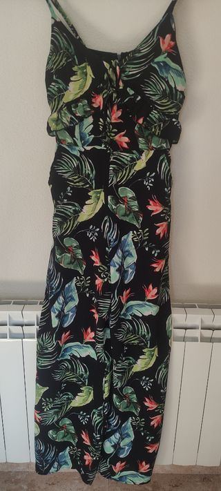 Mono de mujer con un bonito estampado tropical. - Diseño con tirantes. - Cintura elástica. - Piernas anchas. Mono fluido, tejido suave Estampado floral sobre fondo negro, talla S Diseñadora elli White Nunca usado aunque no tiene etiqueta