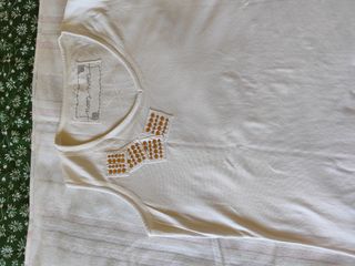 Camiseta blanca con estampado de la Torre Eiffel y mariposas. Aún conserva la etiqueta, está sin estrenar. - Diseño París Paradis. - Cuello redondo y manga corta. -Sisa 41cms, -Largo de cuello al bajo 60cms -De hombro a hombro 35cms -Talla 14 según la marca. S o Xs -100 × 100 algodón