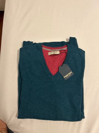 Jersey de punto fino con cuello en V. - Color verde azulado. - Interior en contraste de color rojo. - Etiqueta de Premium Quality incluida.