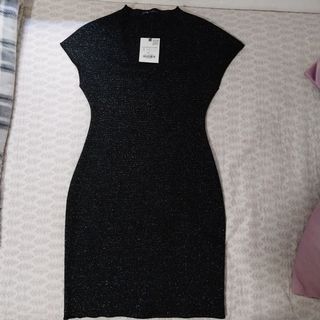 Vestido elegante de corte ajustado. Talla S, nuevo con etiquetas. - Manga corta. - Acabado con brillos plateados.