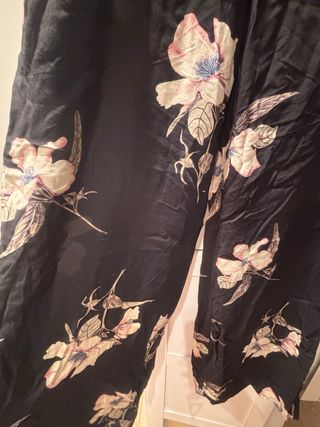 Pantalón de la marca Vila con un bonito estampado floral y bolsillos. - Diseño con flores en tonos rosas y beige - Base en color negro. - Tejido ligero y fluido. Nuevo con etiqueta, precio original 40€.