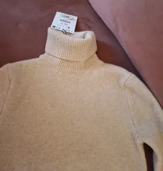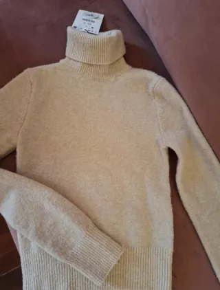 Jersey de punto fino con cuello alto. - Tejido suave y agradable. - Diseño clásico y versátil. Color beige. Completamente nuevo,a estrenar. Con etiqueta.