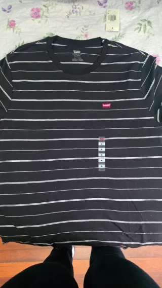 Camiseta de manga corta con un diseño de rayas horizontales blancas sobre fondo negro. Perfecta para un look casual. - Etiqueta original incluida. - Logo de Levi's en el pecho.