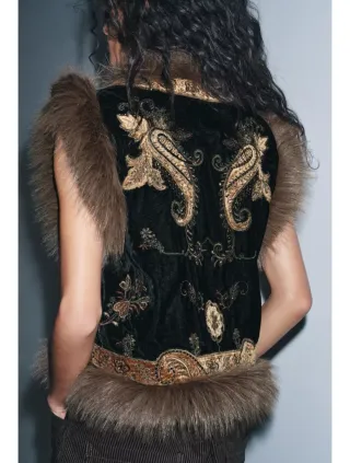 Elegante chaleco de Zara con un diseño bordado y detalles de pelo. - Chaleco limited Edition - Adornado con bordados dorados y negros. - Ribete de pelo sintético en cuello y bajo. Nuevo con etiqueta 🏷 Edición limitada Agotado Viral