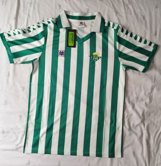 Camiseta de estilo retro con un diseño clásico de rayas verdes y blancas. Perfecta para coleccionistas o aficionados al fútbol. - Talla L - Escudo del equipo bordado en el pecho. - Nueva con Etiqueta