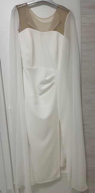 Elegante vestido blanco con capa incorporada, ideal para ocasiones especiales. Aún conserva la etiqueta, indicando que nunca ha sido utilizado. - Diseño con capa fluida. - Tejido de alta calidad.