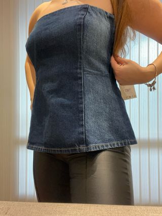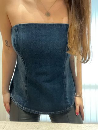 Top vaquero de Zara, con un diseño moderno y favorecedor. Sin estrenar con la etiqueta. - Corte strapless. - Tejido denim. - Detalle de costuras. - Bajo curvo.