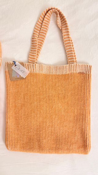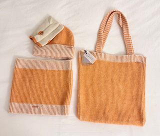 Conjunto de Jo&Mr.Joe formado por bolso, bufanda tipo cuello, gorro y mitones, color naranja y beige. Sin estrenar, con etiquetas.