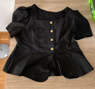 Conjunto de mujer compuesto por: Blusa negra de manga corta con volante Detalle de botones dorados frontales Pantalón negro estilo culotte / tobillero Cintura elástica con cordón ajustable Detalles decorativos en bolsillos Talla: M (según etiqueta) Tejido ligero y cómodo. Ideal para vestir informal elegante, eventos, cena o uso diario arreglado. Perfecto estado general (ver fotos).