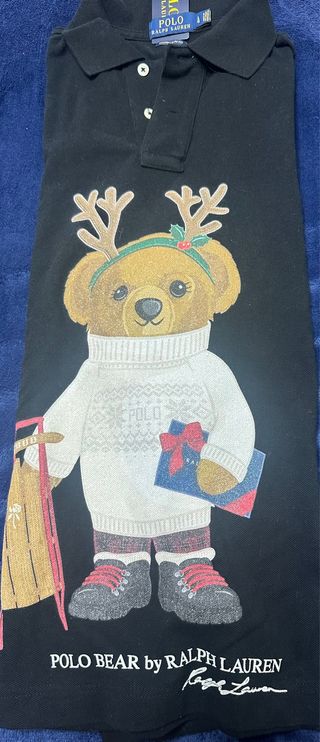 Polo negro de manga larga con un divertido estampado de oso navideño de Polo Ralph Lauren. - Estampado de oso con reno y regalo. - Cuello clásico con botones. - Logo de Polo Ralph Lauren en la etiqueta.