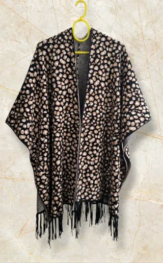 - Bonito poncho, capa. - Muy abrigador. (manta) - Estampado, animal print. - Super cómodo. - Con cinturón de adorno, queda genial. (Cinturón, no incluido) - Ver en las fotografías, el derecho y el revés del tejido. - Muy combinable. - Tejido muy agradable, al tacto. - No necesita plancha. (lavar y poner) > Composición: (ver fotografía, la etiqueta) * MEDIDAS, en las fotografías. > Sirve para varias tallas. * Sin estrenar. > COLORES: - camel - blanco - negro
