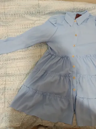 Vestido de tela fina en un bonito tono azul cielo. Presenta un diseño con cuello camisero y botones dorados. - Mangas largas abullonadas. - Falda con varios volantes. - Cierre de botones en la parte delantera.
